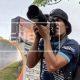 Fabián Grillo junto al retrato de su hijo Pablo, en el “camarazo” realizado el martes 18 de marzo frente al Hospital Ramos Mejía donde el fotógrafo se encuentra internado. Crédito: Kaloian Santos Cabrera.